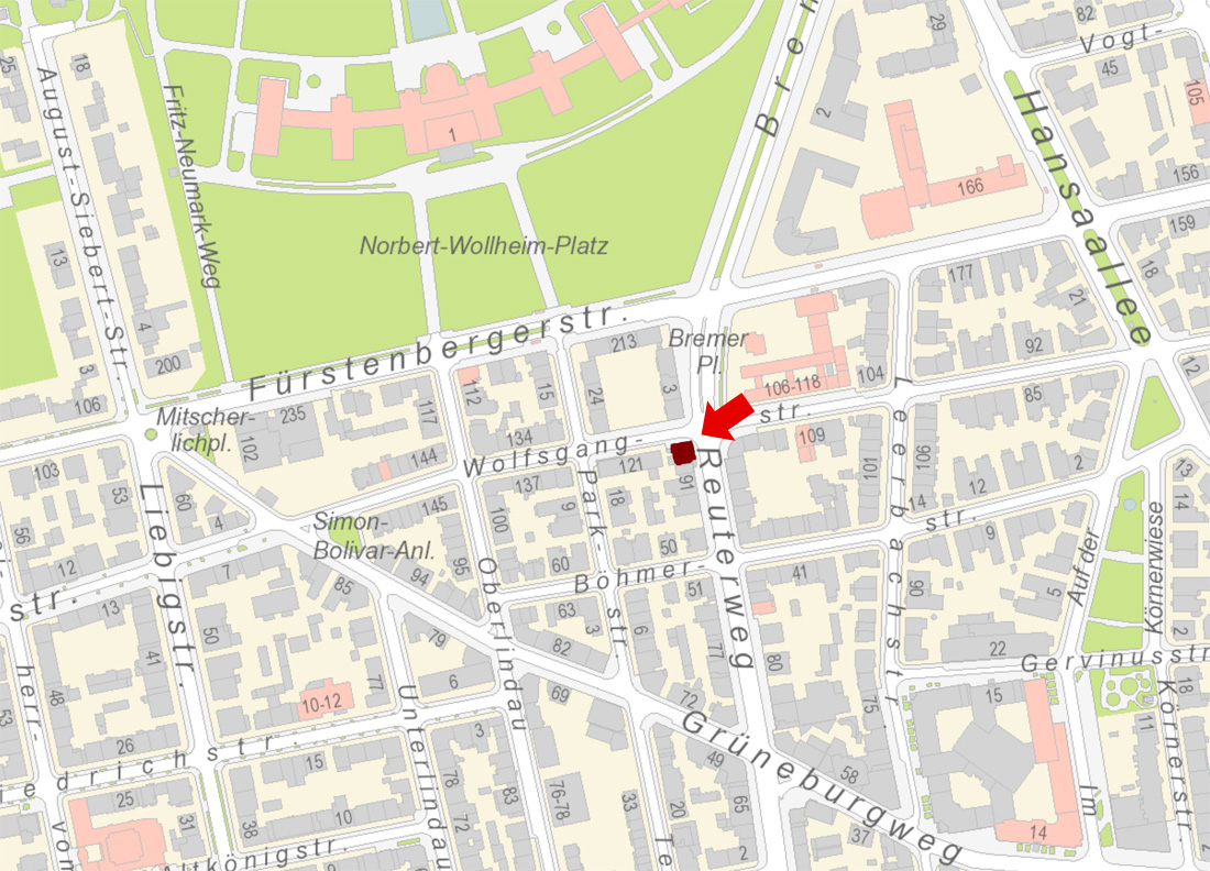 - Nach ca. 800 m auf der linken Seite an der Kreuzung Reuterweg (93) und Wolfsgangstr. (119) finden Sie unsere Kanzlei im 1. OG.